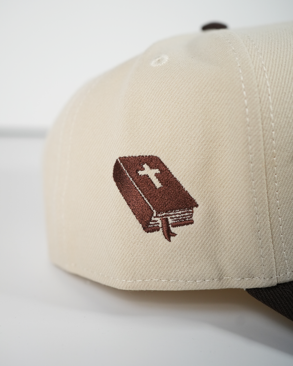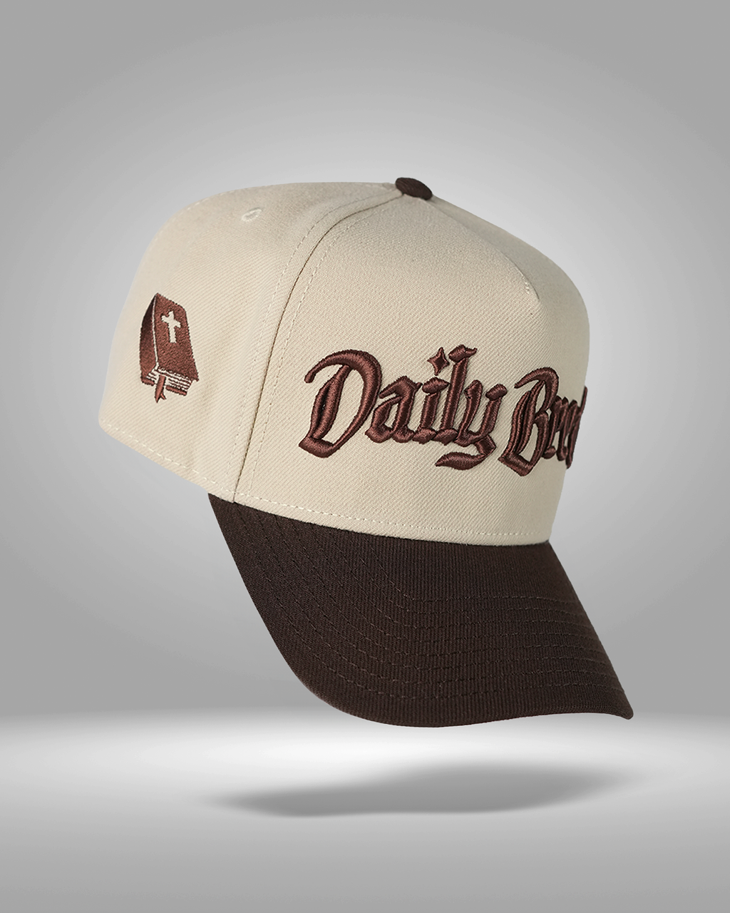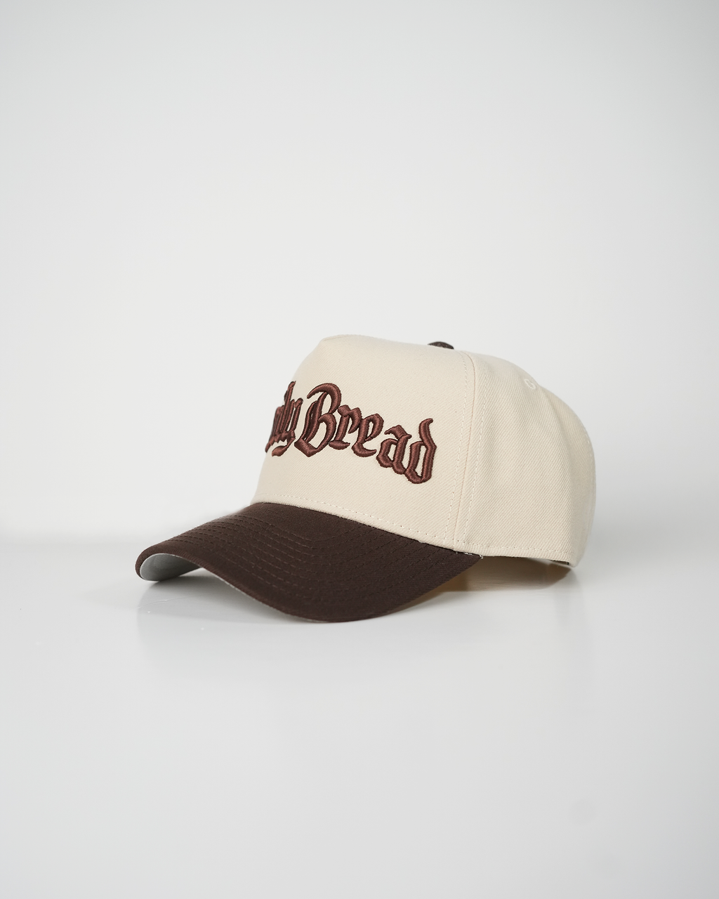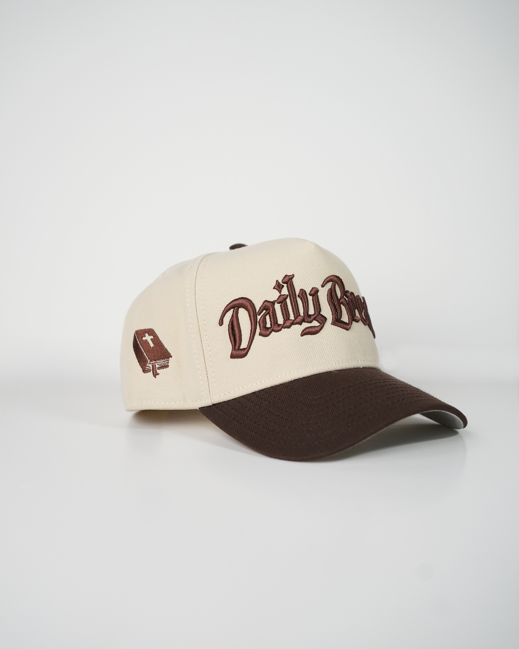 A wearable reminder of God's daily provision and care. "Daily Bread" features tan and brown tones with detailed embroidery inspired by Matthew 6:11, "Give us this day our daily bread.