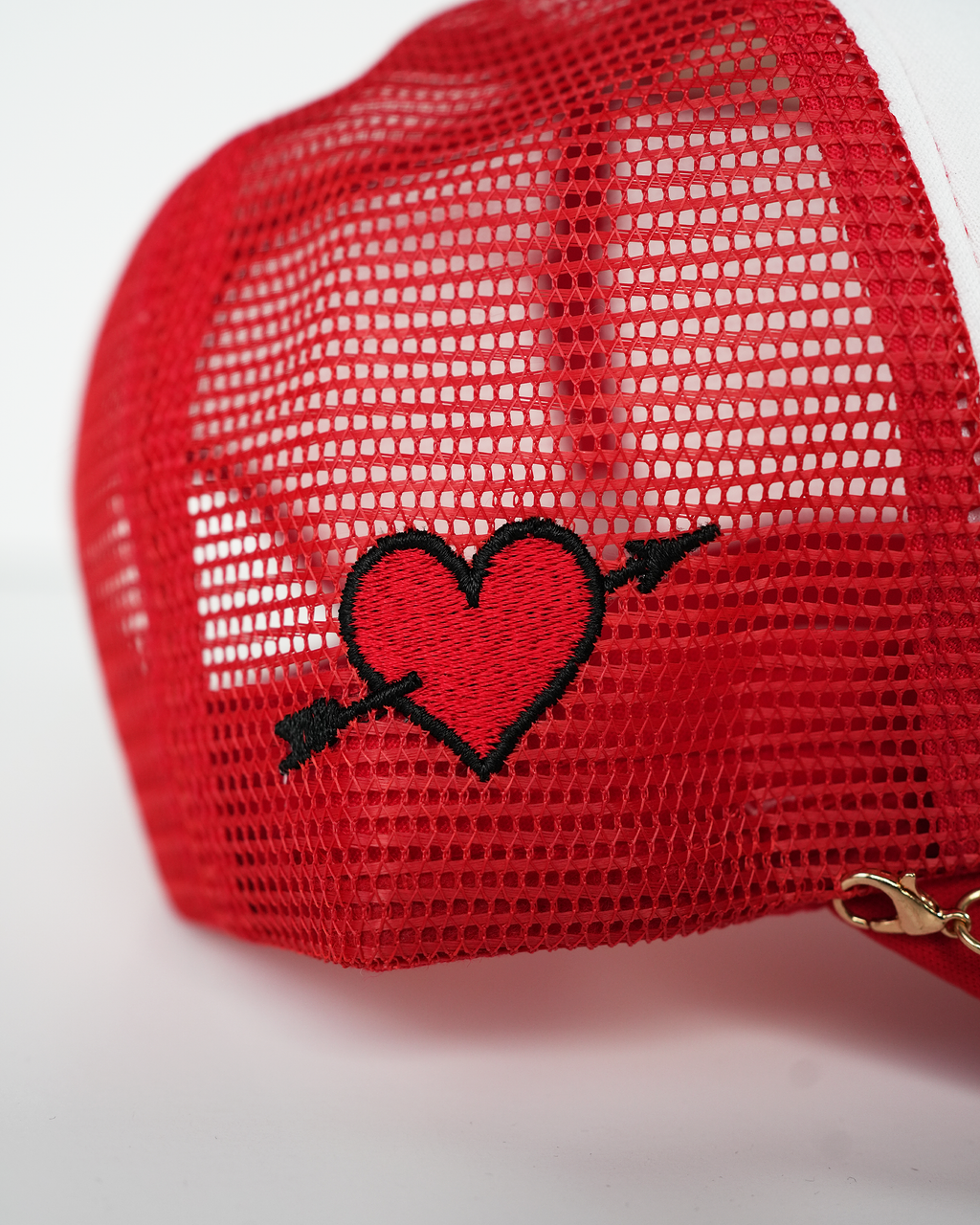 Pearl Love Trucker is the perfect counterpart to Cupid Corduroy. Finished with pearl detailing and a stitched heart on the side.