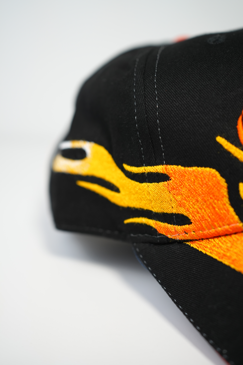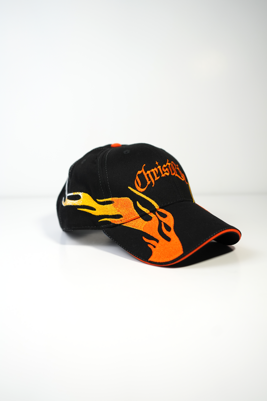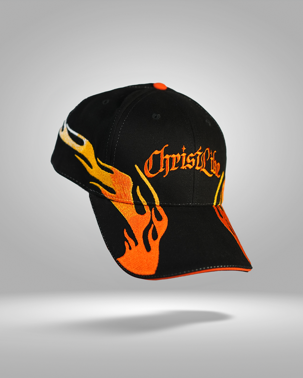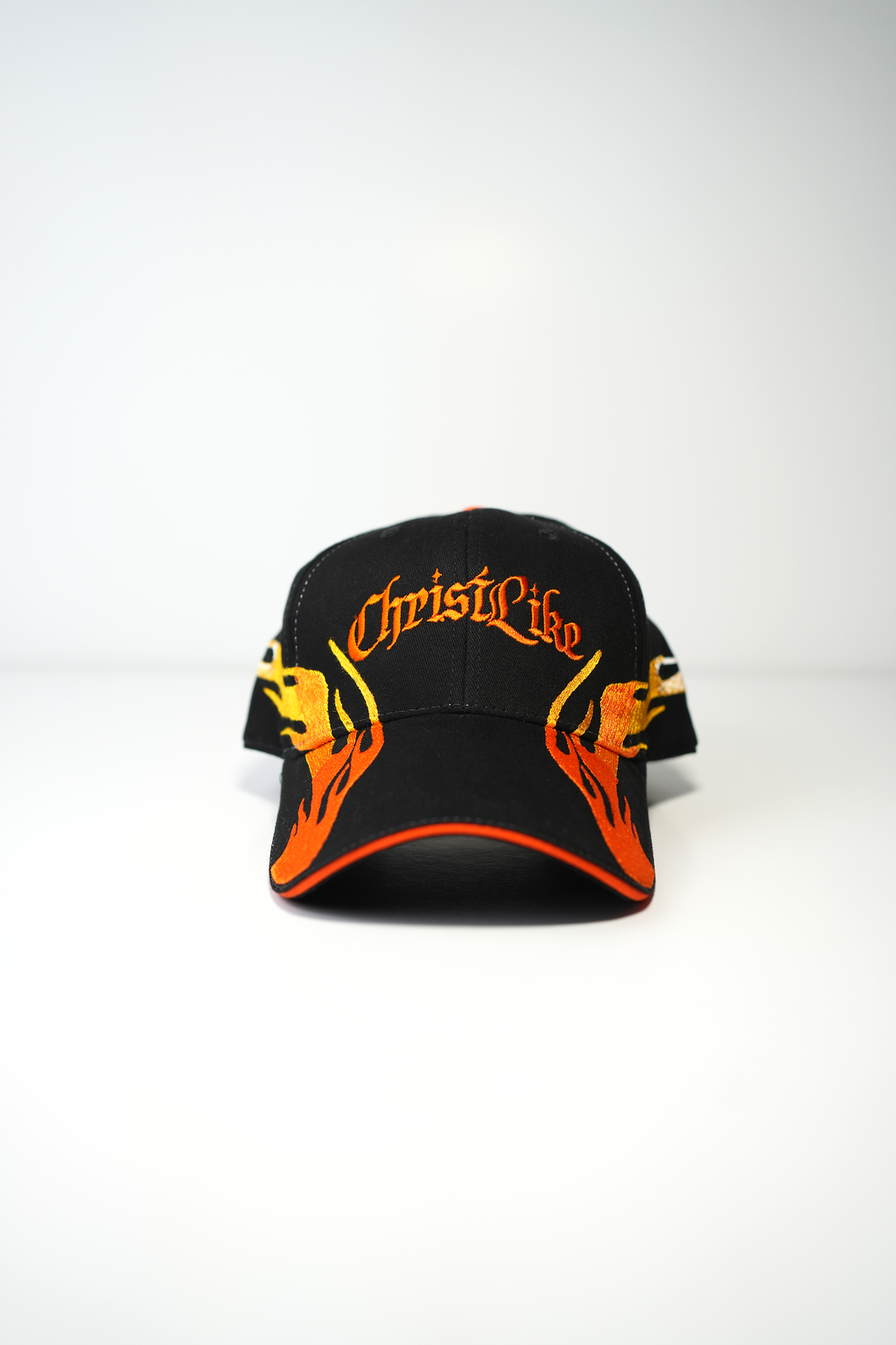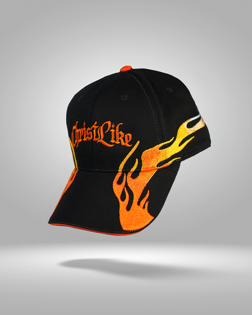 Embroidered flames wrapping across the brim and panels, symbolizing divine resilience. The Christlike logo sits proudly on the crown, reminding you that every trial only strengthens your faith.